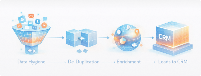 Data hygiene, de-duplication, and enrichment before leads hit your CRM
